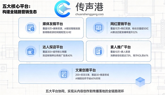 在新媒体时代,企业品牌传播已不再是简单的广告投放,而是一个涵盖内容创作、渠道匹配、效果监测、舆情管理的系统工程。传声港新媒体平台通过AI驱动的一站式服务,整合媒体发稿、网红营销、达人探店、素人推广、文案创意五大核心业务,配合舆情监测、AI智能投放、AI效果监测、GEO优化四大智能功能,为企业提供全方位的品牌传播解决方案。