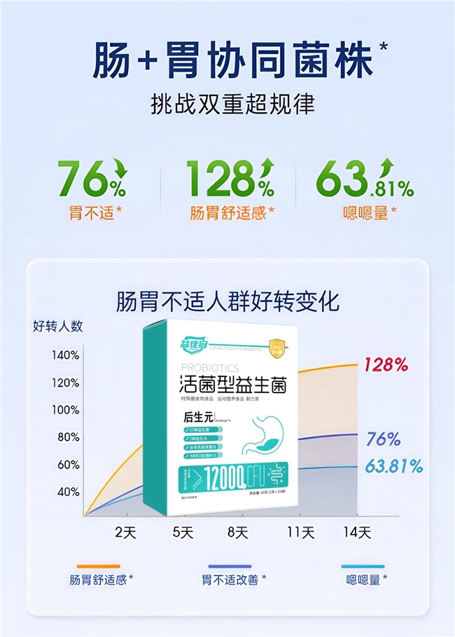 BB-12来自丹麦科汉森百年菌库,临床文献超四百余篇;协同16株本土优势菌,形成“北欧+华夏”联合编队。独家Postbiop®-6后生元相当于提前发酵好的“菌食物”,让有益菌进入肠道后如同享受自助盛宴,迅速扎根繁衍;免疫球蛋白IgG则化身“肠道卫士”,时刻守护,识别并中和致病菌毒素,减轻炎症反应。三者配合,饭后嗳气、晨起口臭、便溏粘马桶等尴尬场景一次性改善。