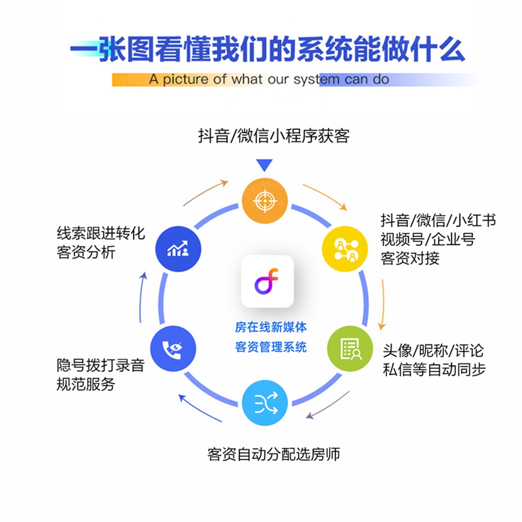 全渠道获客矩阵:打通抖音、微信、视频号等新媒体平台,支持微信房产小程序找房平台,抖音房产小程序,房源一键群发外网平台等多渠道曝光获客。私域运营方面,提供九宫格海报、房源海报、拓客资讯等丰富多样的获客营销工具。