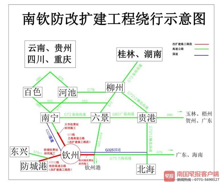 需途径该改扩建施工路段的司乘人员可选择G325国道(南北二级路)、贵港至合浦高速(G7212贵合高速)、南宁六景至钦州港高速公路(S43六钦高速)、S312省道等出行路线。