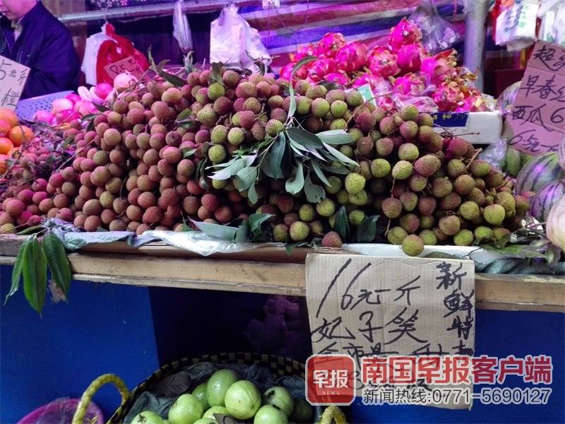▲图为南宁明秀市场水果摊上的妃子笑荔枝价格为30元/公斤。南国早报客户端记者张文卉/摄