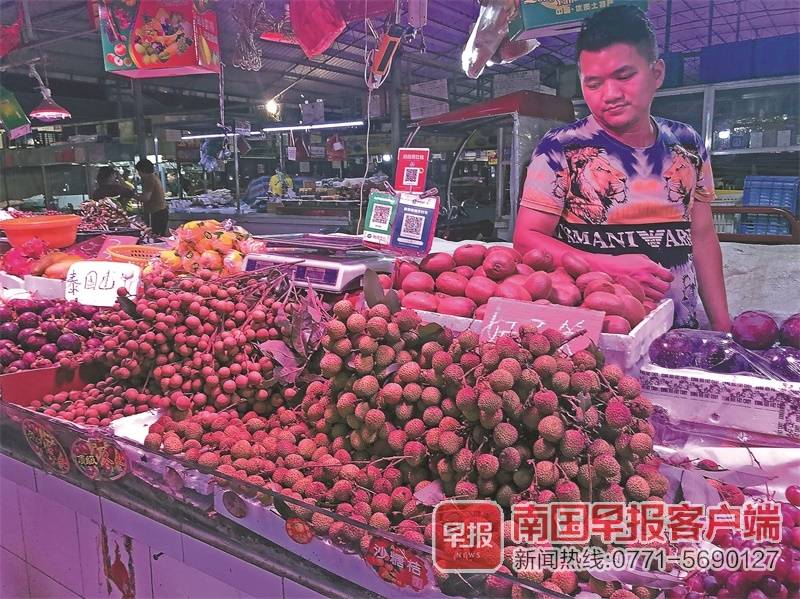 ▲5月8日,南宁官塘菜市场果摊上,已有妃子笑上市。南国早报客户端记者周寒/摄