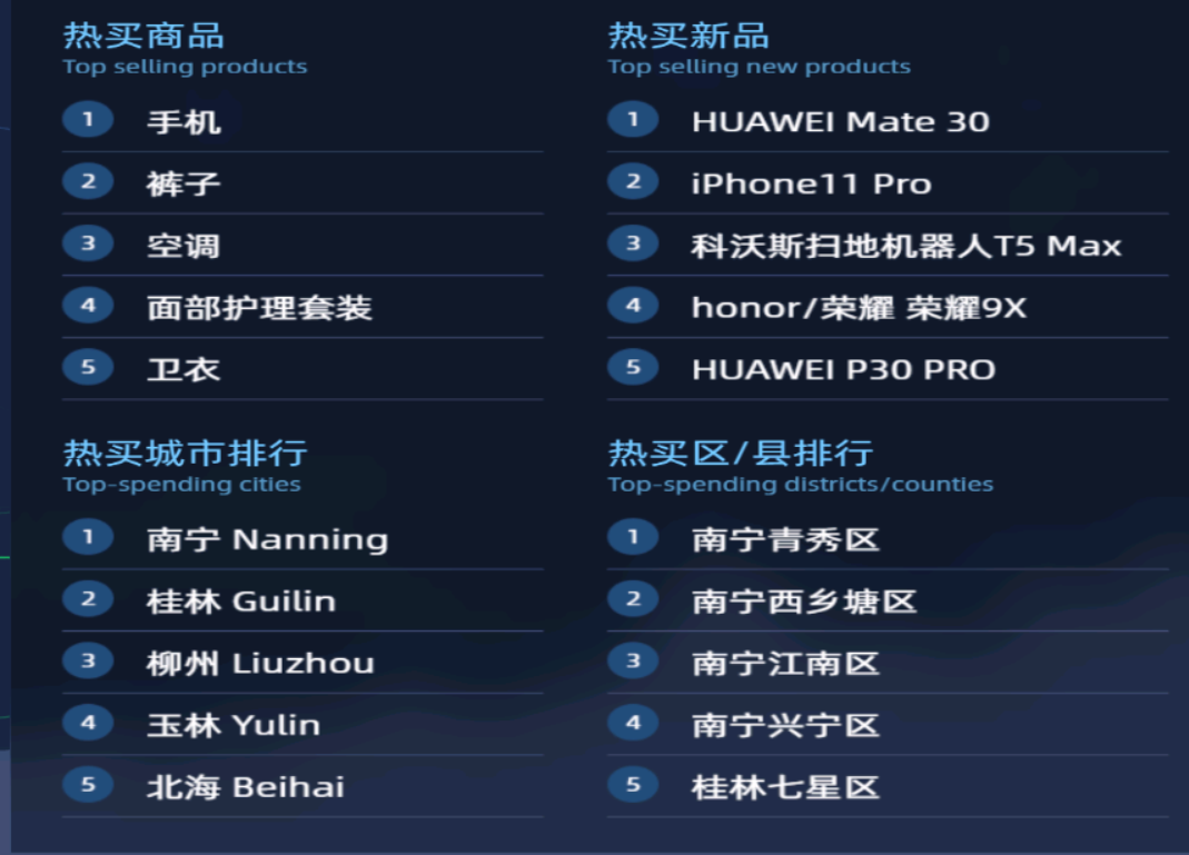 广西人热买的商品为手机、裤子、空调、面部护理套装、卫衣。热买的新品是HUAWEI Mate 30、iPhone 11 Pro、科沃斯扫地机器人T5 Max、honor/荣耀 荣耀9X、HUAWEI nova 5z,与其他省市相比,广西人对荣耀手机情有独钟,其余四种与大部分省份相同。